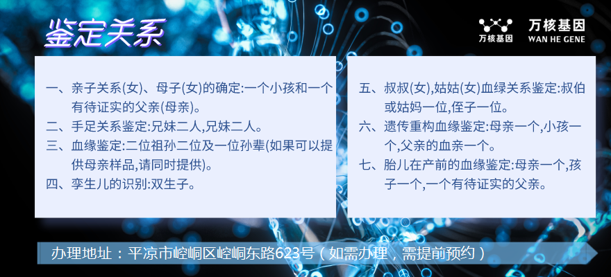 關(guān)于平?jīng)龅挠H子鑒定類型及收費(fèi),平?jīng)鋈f(wàn)核基因?yàn)槟峁┮韵滦畔ⅲ?/strong>